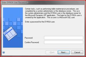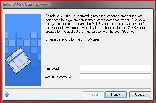 When I completed my GP SP3 installation and started GP Utilities to complete the upgrade and configuration, I was prompted to enter and confirm a password for the user DYNSA, as shown below:
