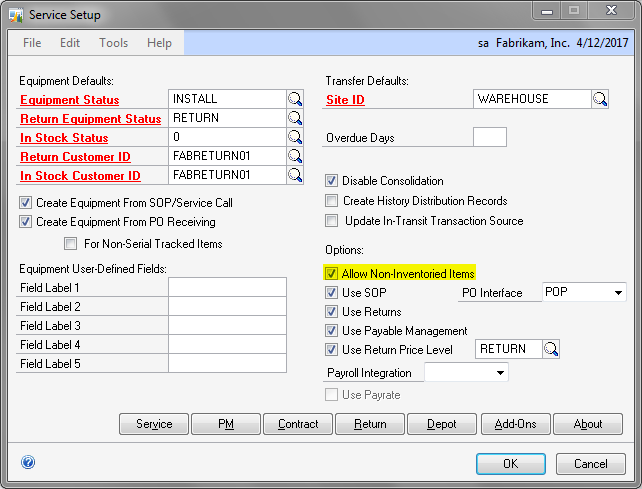 To enter Non-Inventory Items on a Service Call Spares window, one must enable “Allow Non-Inventoried Items” under “Options” section in “Service Setup” form, which is accessed from Microsoft Dynamics GP -> Tools -> Setup -> Project -> Service Setup. Shown as below: