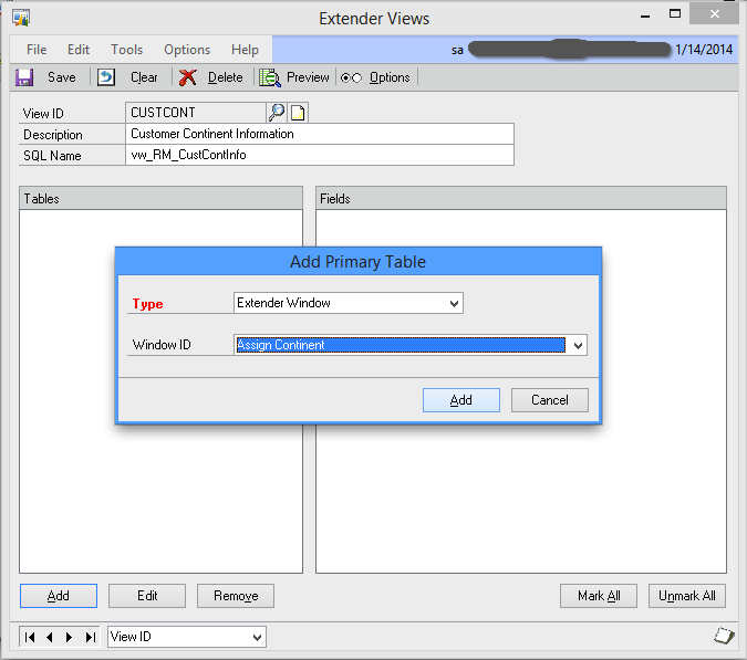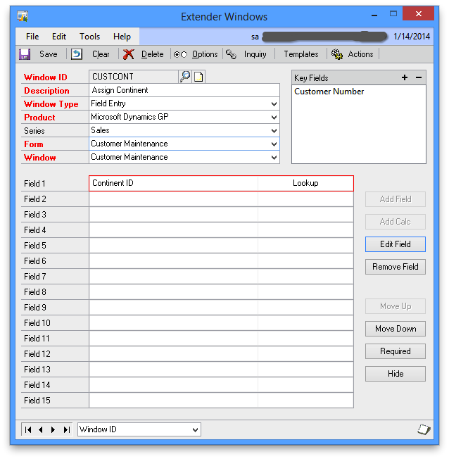 Second step; I am going to create an Extender Window for Customer Maintenance (Cards -> Sales -> Customer -> Additional -> Continent) to assign a continent to a customer. Extender Window definition is as follows:
