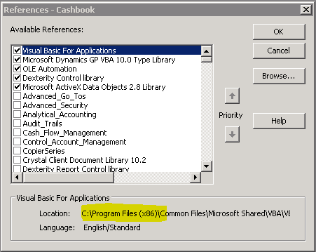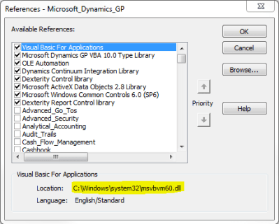 3. I launched GP and opened the VBA Editor, to make sure that the Visual Basic for Applications Reference is pointing to the path C:\Program Files\Common Files\microsoft shared\VBA\VBA6\VBE6.DLL.