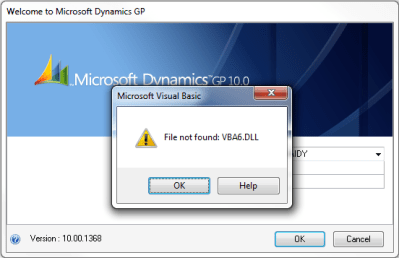 The following are the steps to fix this issue, taken directly from Dynamics GP Partner Forum Post (Link To the Original Post: File Not Found: VBA6.dll):