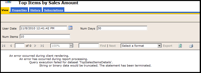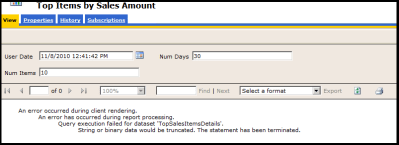 The error message mentions that there is an extra bit of string data that’s getting forcefully truncated due to size restrictions. This clearly indicates a SQL Error Message. I ran the SQL Profiler furthering the probe. And the issue was rounded in to a Stored Procedure which is run to extract the needed data for this Chart & KPI, which is seeSOPTopTenSalesItemsByPriceMetric.