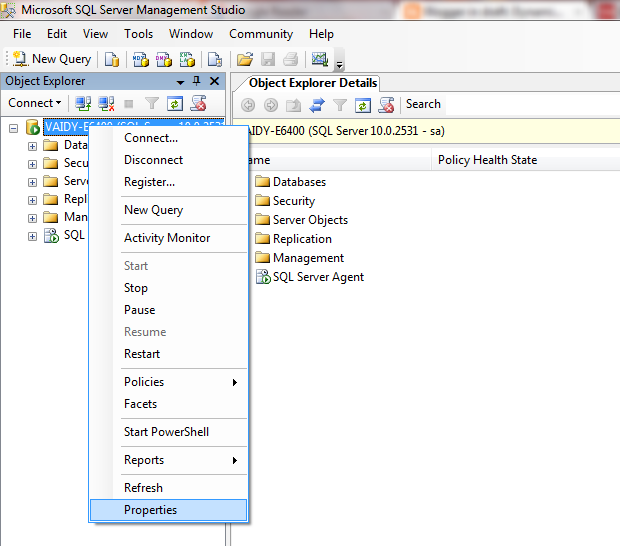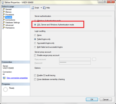 Point to Remember: If you enter “sa” and it’s password correctly and still you are invited with a message that reads like “Login failed”, then make sure that SQL Authentication mode is “SQL Server and Windows Authentication Mode”.